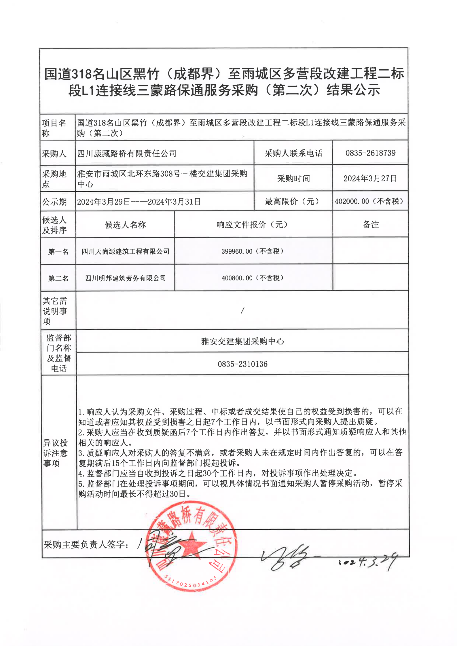 四川康藏路橋有限責(zé)任公司國(guó)道318名山區(qū)黑竹(成都界)至雨城區(qū)多營(yíng)段改建工程二標(biāo)段L1連接線(xiàn)三蒙路保通服務(wù)(第二次)結(jié)果公示
