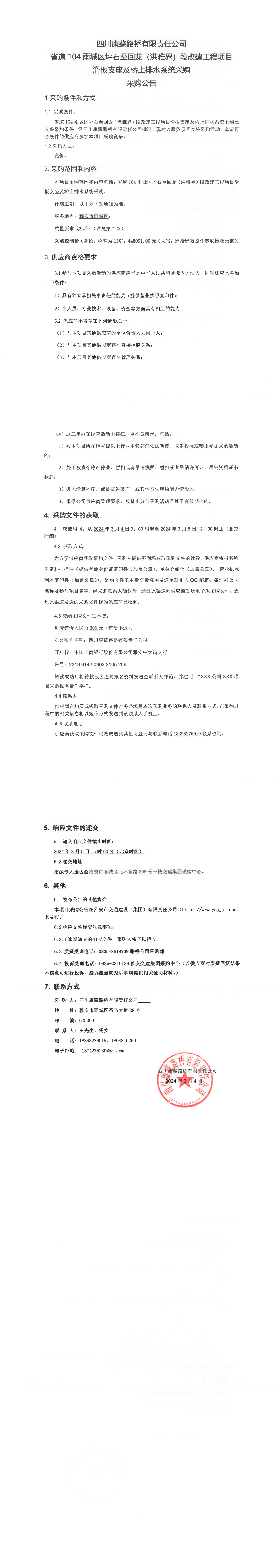 四川康藏路橋有限責任公司省道104雨城區(qū)坪石至回龍(洪雅界)段改建工程項目滑板支座及橋上排水系統(tǒng)采購公告