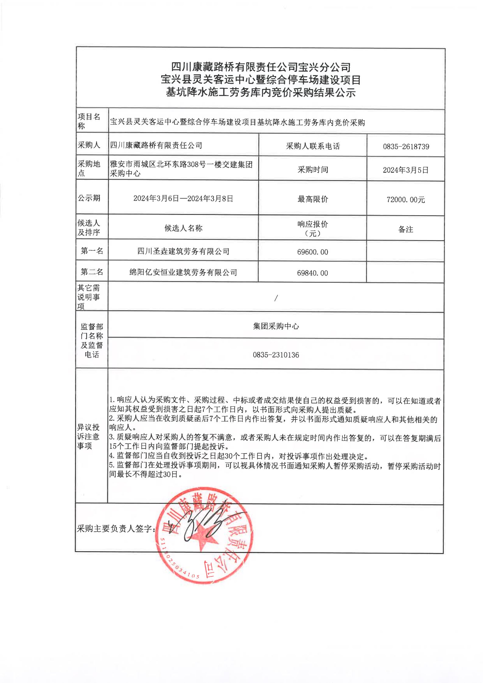 四川康藏路橋有限責任公司寶興分公司寶興縣靈關(guān)客運站中心暨綜合停車場建設(shè)項目基坑降水施工勞務(wù)庫內(nèi)競價采購結(jié)果公示