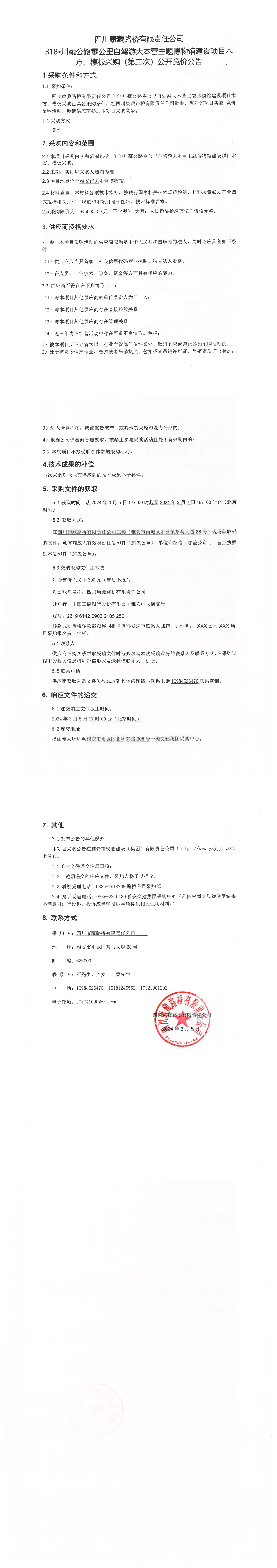 四川康藏路橋有限責(zé)任公司318·川藏公路零公里自駕游大本營主題博物館建設(shè)項(xiàng)目木方、模板采購(第二次)公開競價公告