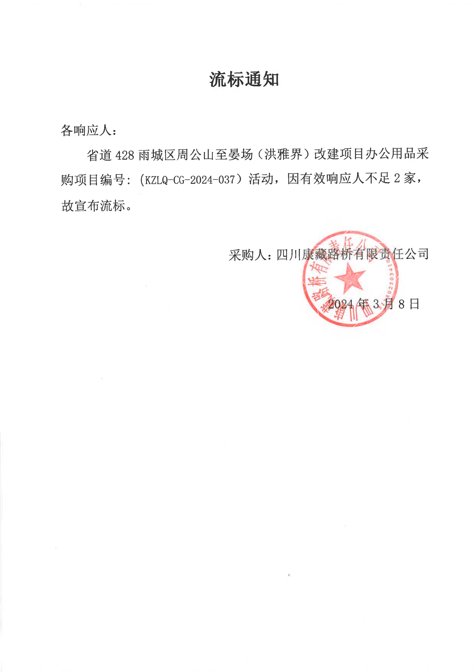 四川康藏路橋有限責(zé)任公司省道428雨城區(qū)周公山至晏場(洪雅界)改建項(xiàng)目辦公用品采購流標(biāo)通知