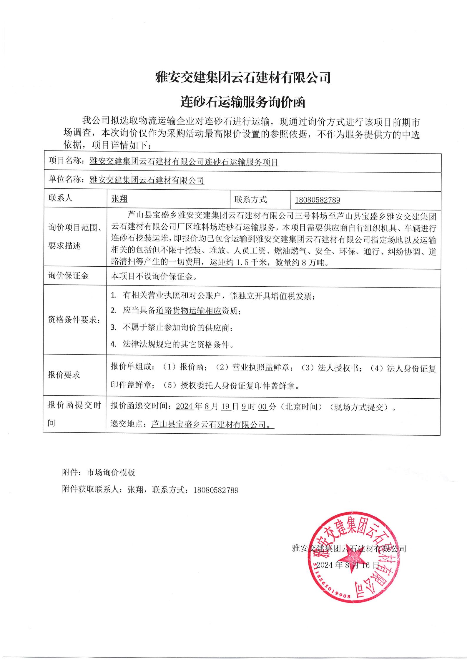 雅安交建集團(tuán)云石建材有限公司連砂石運(yùn)輸服務(wù)詢價函