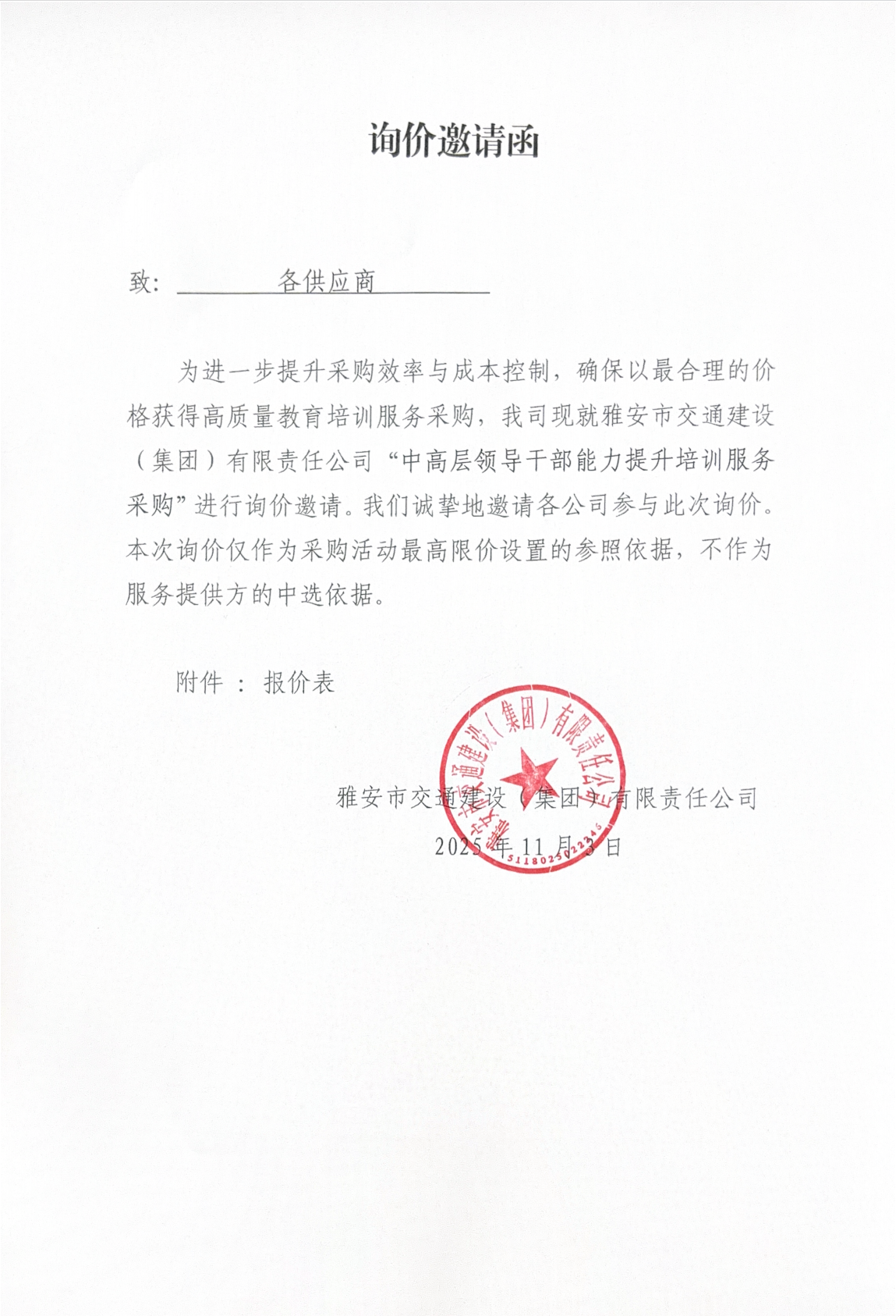 關(guān)于雅安交建集團(tuán)下屬子公司主要負(fù)責(zé)人經(jīng)濟(jì)責(zé)任審計項(xiàng)目限價的詢價函