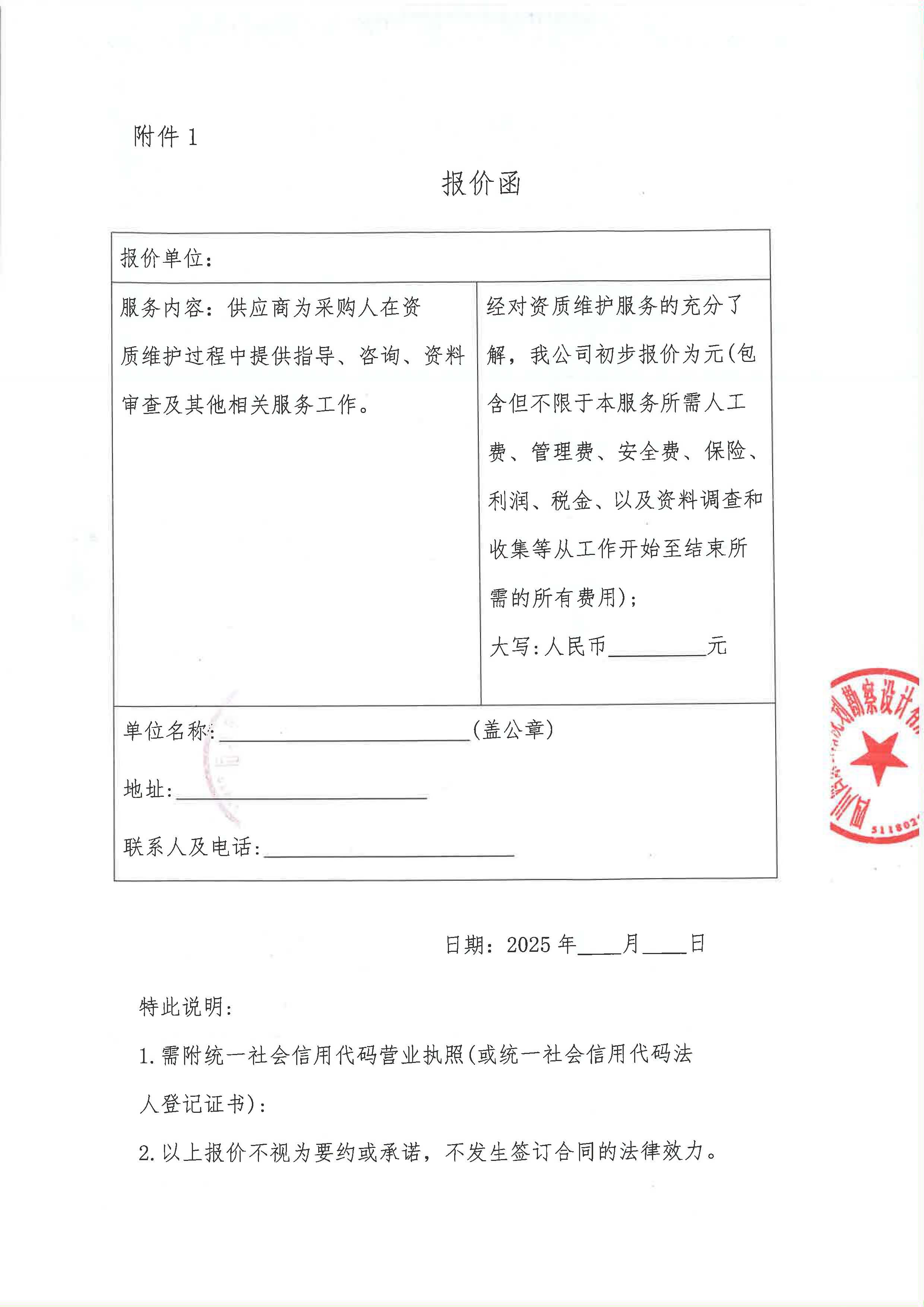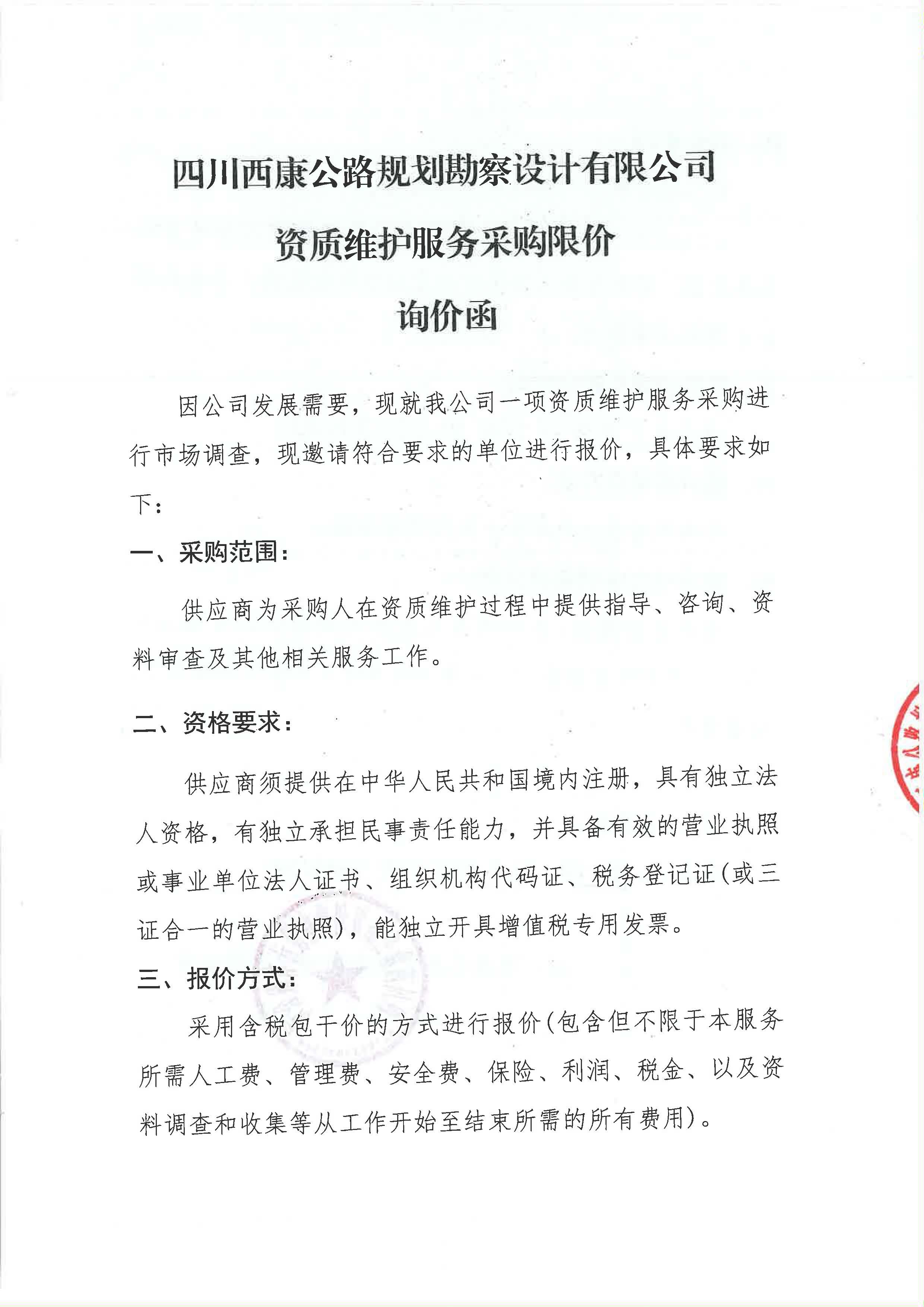 四川西康公路規(guī)劃勘察設(shè)計(jì)有限公司資質(zhì)維護(hù)服務(wù)采購(gòu)限價(jià)詢(xún)價(jià)函