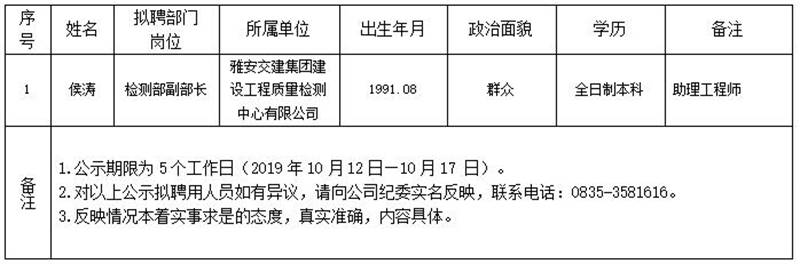 雅安交建集團(tuán)子公司擬聘用人員公示(工程質(zhì)量檢測中心)