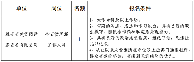 根據(jù)發(fā)展需要,決定面向社會(huì)公開(kāi)招聘雅安市交通建設(shè)(集團(tuán))有限責(zé)任公司(以下簡(jiǎn)稱(chēng)“雅安交建集團(tuán)”)所屬子公司工作人員1名,現(xiàn)將有關(guān)事項(xiàng)公告如下: