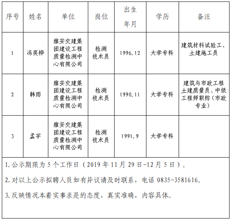 雅安交建集團(tuán)子公司擬聘用人員公示(大興公司)