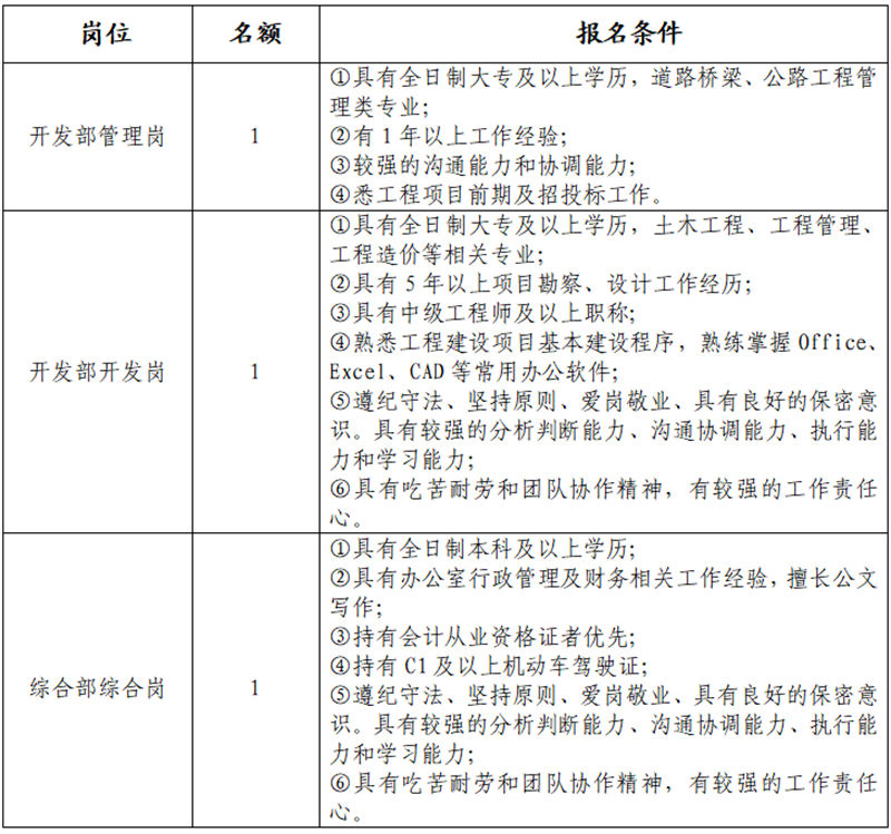 雅安交建集團(tuán)大興交通開發(fā)有限公司是雅安市重點國有企業(yè)雅安市交建集團(tuán)下屬子公司,主要從事交通基礎(chǔ)設(shè)施及服務(wù)設(shè)施投資、建設(shè)開發(fā);土地整理;房地產(chǎn)開發(fā);建筑材料生產(chǎn)、銷售;旅游開發(fā)等業(yè)務(wù)。根據(jù)公司發(fā)展需要,決定面向社會公開招聘3名工作人員,現(xiàn)將有關(guān)事項公告如下: