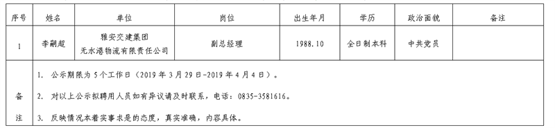 雅安交建集團子公司擬聘用人員公示(無水港物流公司)