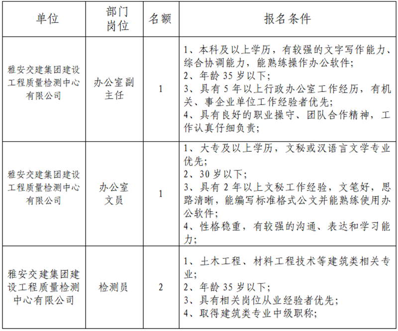 根據(jù)發(fā)展需要,決定面向社會(huì)公開(kāi)招聘雅安市交通建設(shè)(集團(tuán))有限責(zé)任公司(以下簡(jiǎn)稱(chēng)“雅安交建集團(tuán)”)所屬子公司工作人員4名,現(xiàn)將有關(guān)事項(xiàng)公告如下: