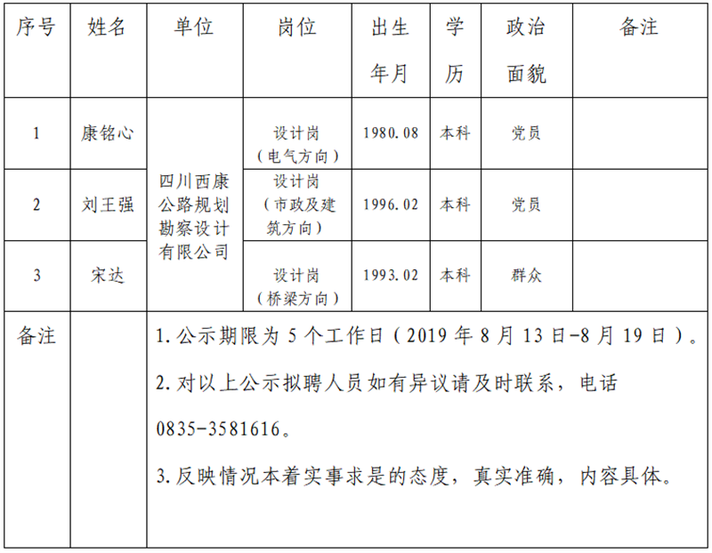 雅安交建集團(tuán)子公司擬聘用人員公示(勘察設(shè)計(jì)公司)