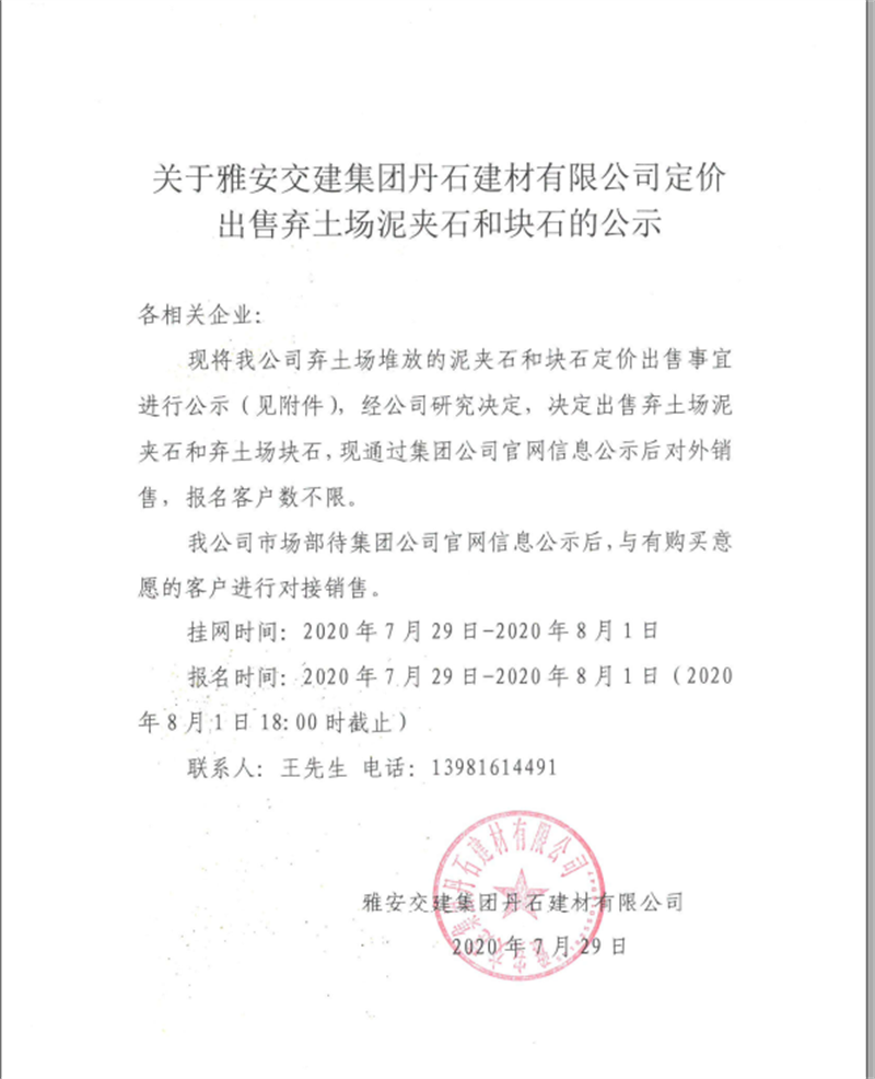 關(guān)于雅安交建集團(tuán)丹石建材有限公司定價(jià)出售棄土場(chǎng)泥夾石和塊石的公示