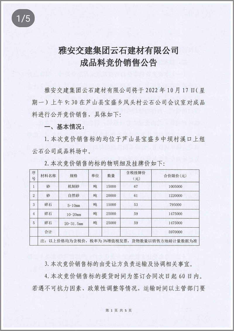 雅安交建集團(tuán)云石建材公司成品料競價銷售公告10.13