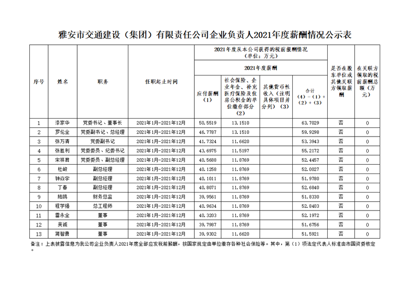 :雅安市交通建設(shè)(集團)有限責(zé)任公司企業(yè)負責(zé)人2021年度薪酬情況公示表
