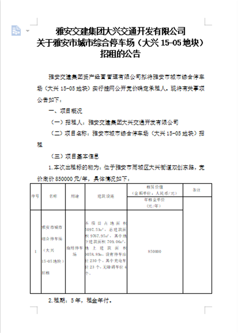 雅安交建集團(tuán)大興交通開(kāi)發(fā)有限公司關(guān)于雅安市城市綜合停車場(chǎng)(大興15-05地塊)招租的公告