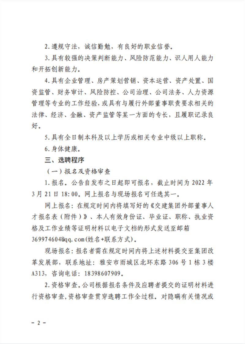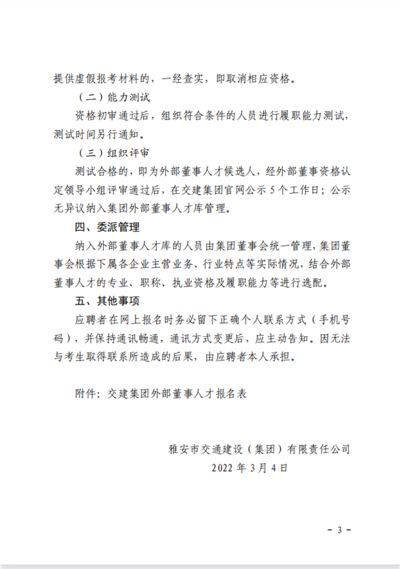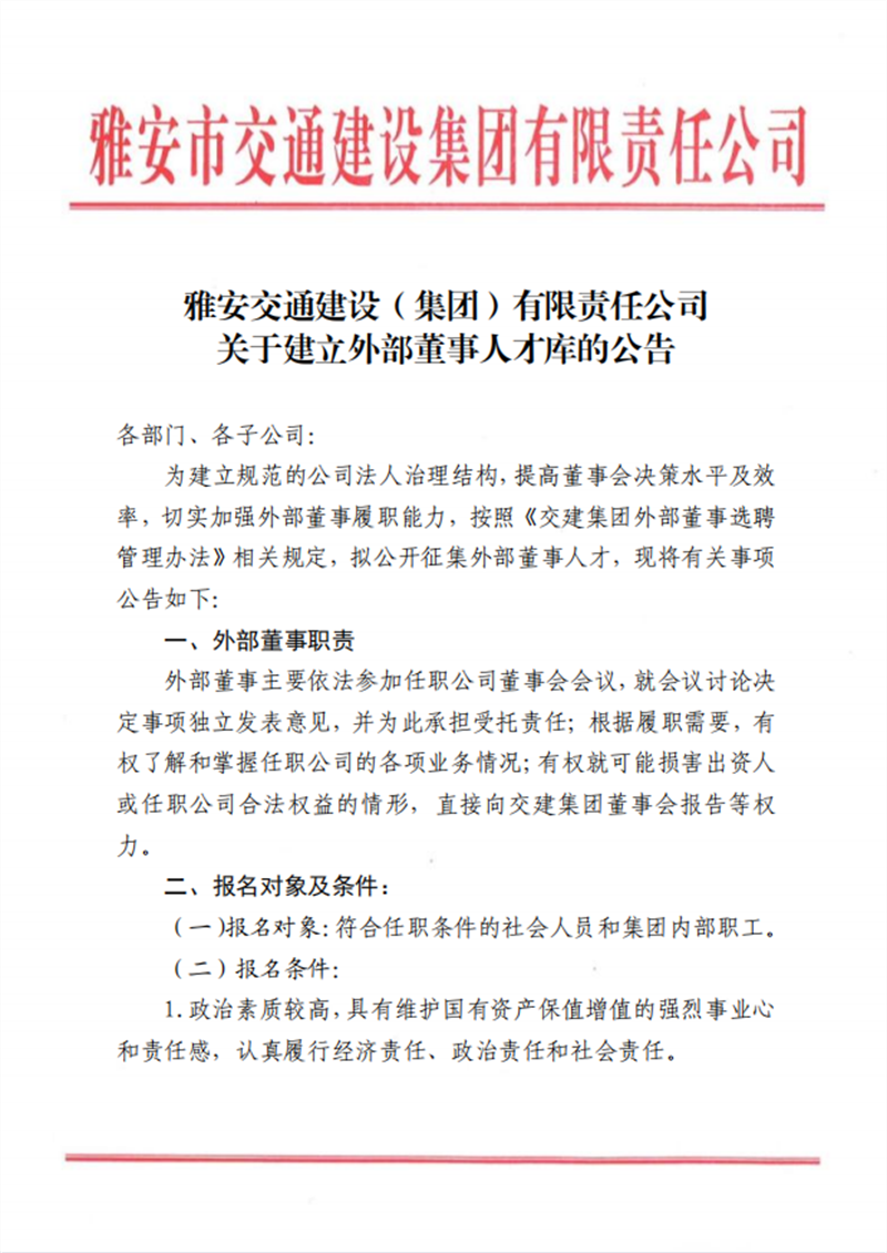 雅安交通建設(shè)(集團)有限責(zé)任公司 關(guān)于建立外部董事人才庫的公告