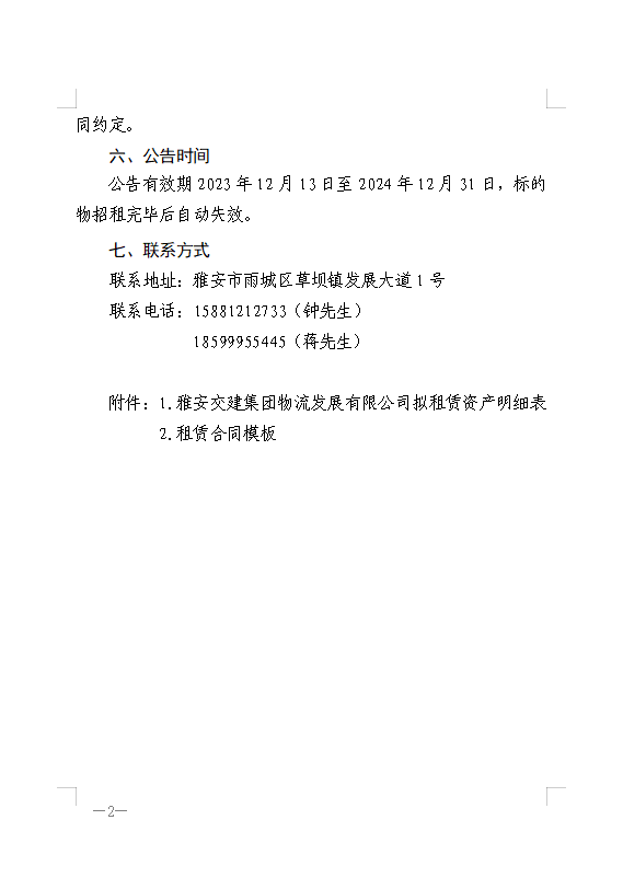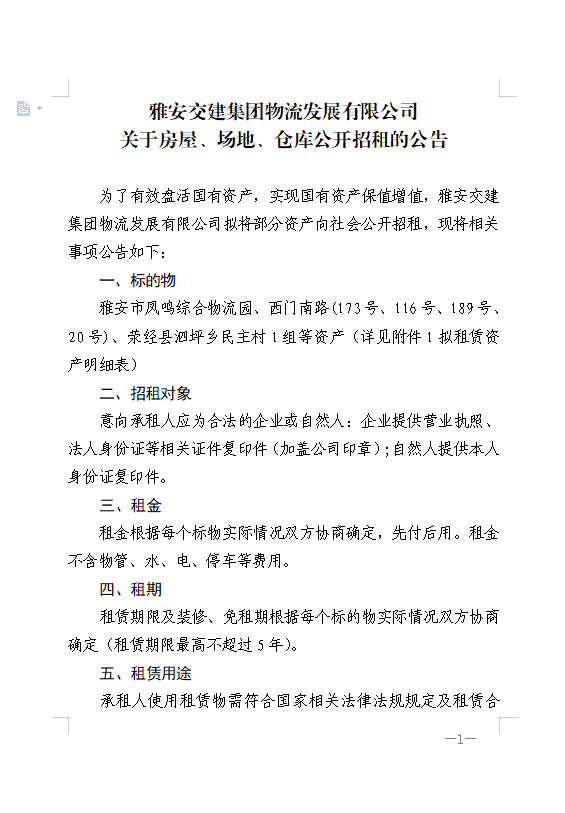 雅安交建集團(tuán)物流發(fā)展有限公司關(guān)于房屋、場地、倉庫公開招租的公告附件1、2