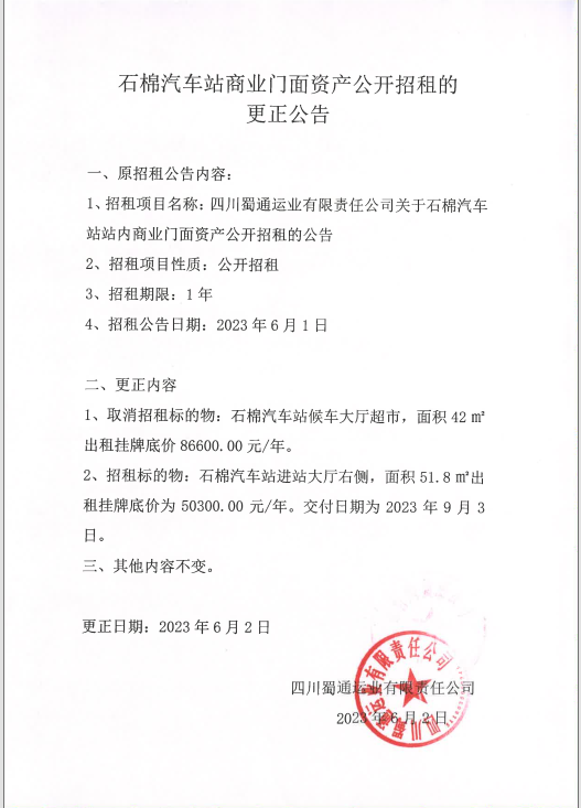 蜀通公司石棉汽車(chē)站商業(yè)門(mén)面資產(chǎn)公開(kāi)招租的更正公告