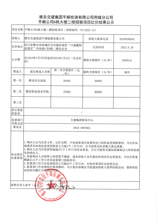 平順公司A棟大樓二樓招租項目比價結(jié)果公示