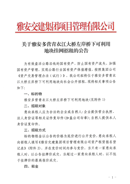 雅安交建集團(tuán)項目管理有限公司關(guān)于雅安多營青衣江大橋左岸橋下可利用地塊掛網(wǎng)招租的公告