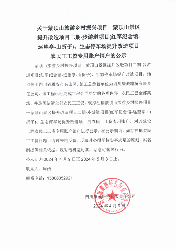 關(guān)于蒙頂山旅游鄉(xiāng)村振興項目一蒙頂山景區(qū)提升改造項目二期-步游道項目(紅軍紀(jì)念館遠望亭-山折子)、生態(tài)停車場提升改造項目農(nóng)民工工資專用賬戶銷戶的公示