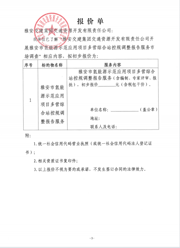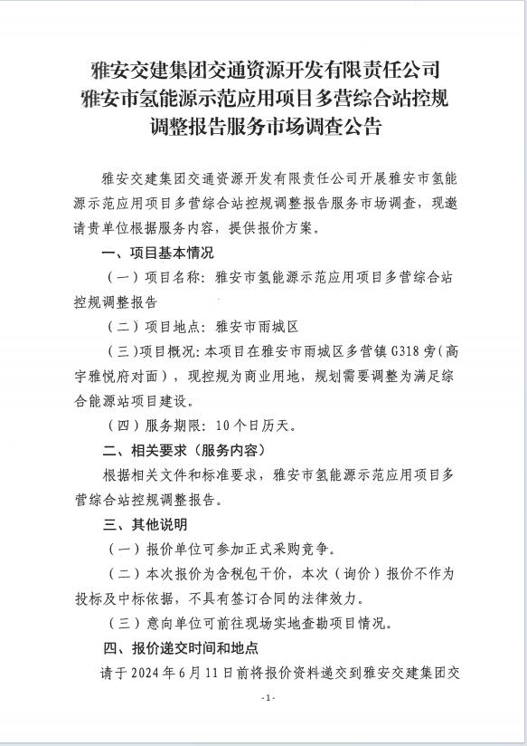 雅安交建集團交通資源開發(fā)有限責任公司雅安市氫能源示范應用項目多營綜合站控規(guī)調整報告服務市場調查公告