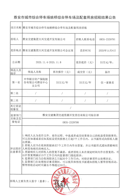 雅安市城市綜合停車場姚橋綜合停車場及配套用房招租結(jié)果公告