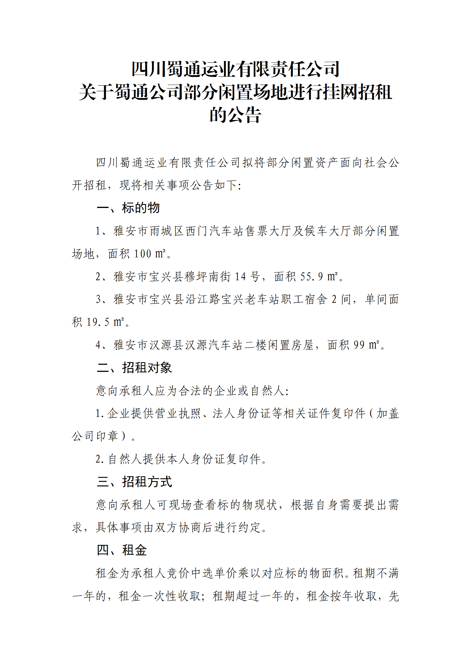 四川蜀通運業(yè)有限責(zé)任公司 關(guān)于蜀通公司部分閑置場地進(jìn)行掛網(wǎng)招租的公告