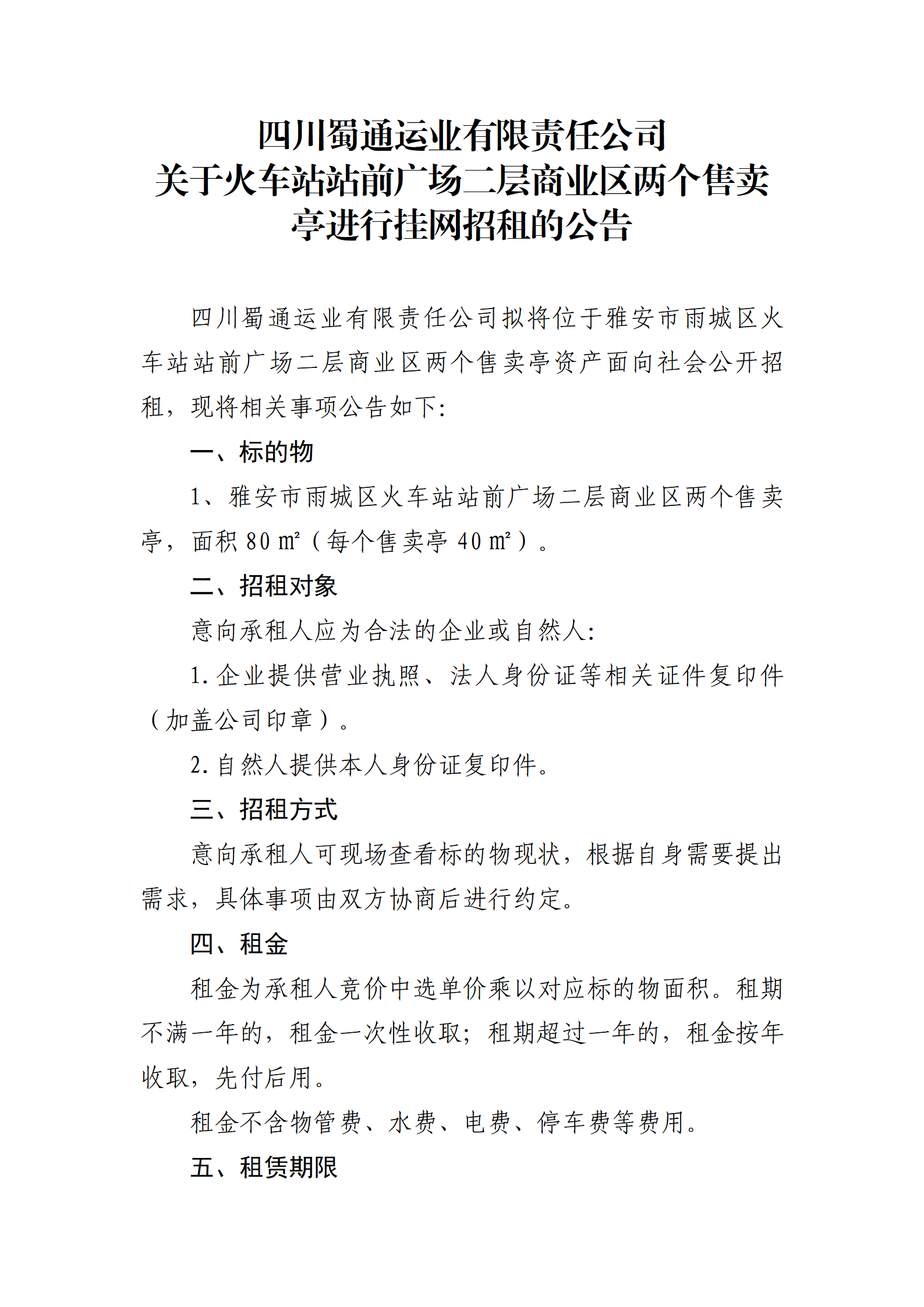 四川蜀通運業(yè)有限責任公司關于火車站站前廣場二層商業(yè)區(qū)兩個售賣亭進行掛網(wǎng)招租的公告