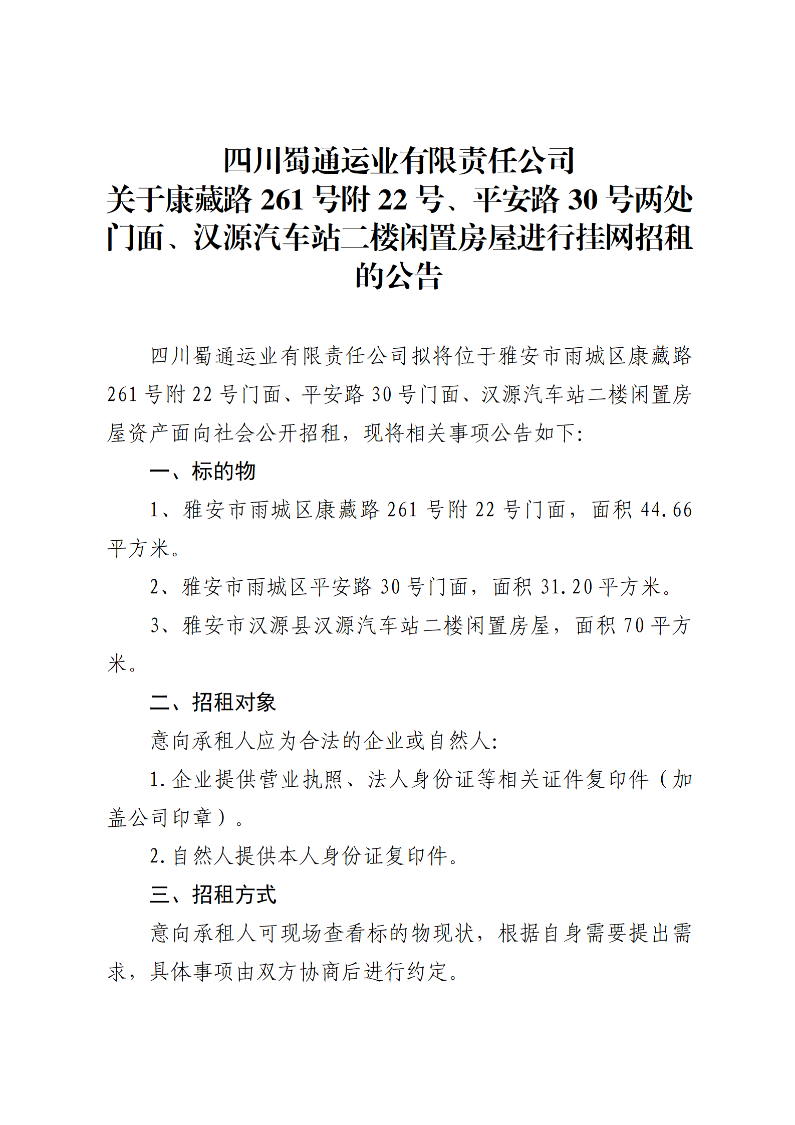 四川蜀通運業(yè)有限責(zé)任公司 關(guān)于康藏路261號附22號、平安路30號兩處門面、漢源汽車站二樓閑置房屋進(jìn)行掛網(wǎng)招租的公告