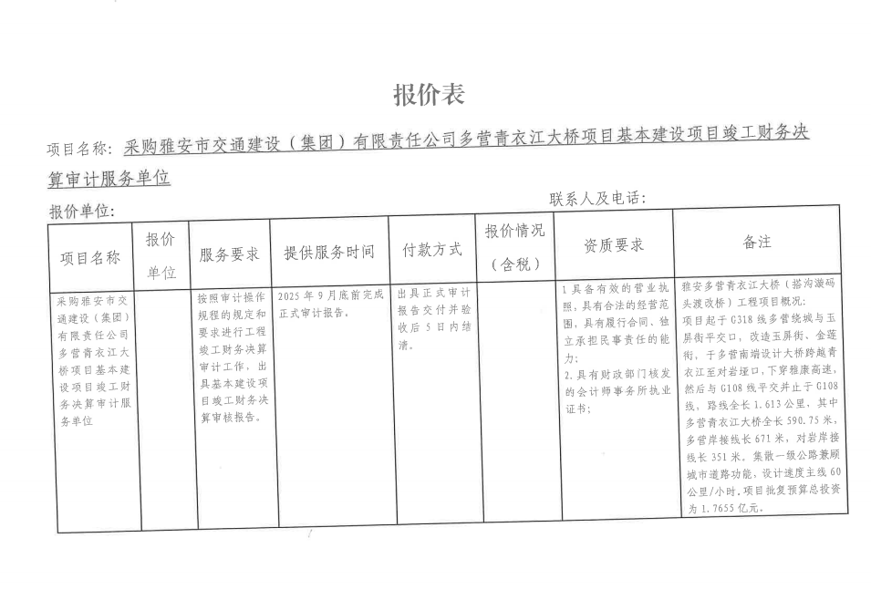 詢價(jià)邀請(qǐng)函——采購(gòu)雅安市交通建設(shè)(集團(tuán))有限責(zé)任公司多營(yíng)青衣江大橋項(xiàng)目基本建設(shè)項(xiàng)目竣工財(cái)務(wù)決算審計(jì)服務(wù)單位
