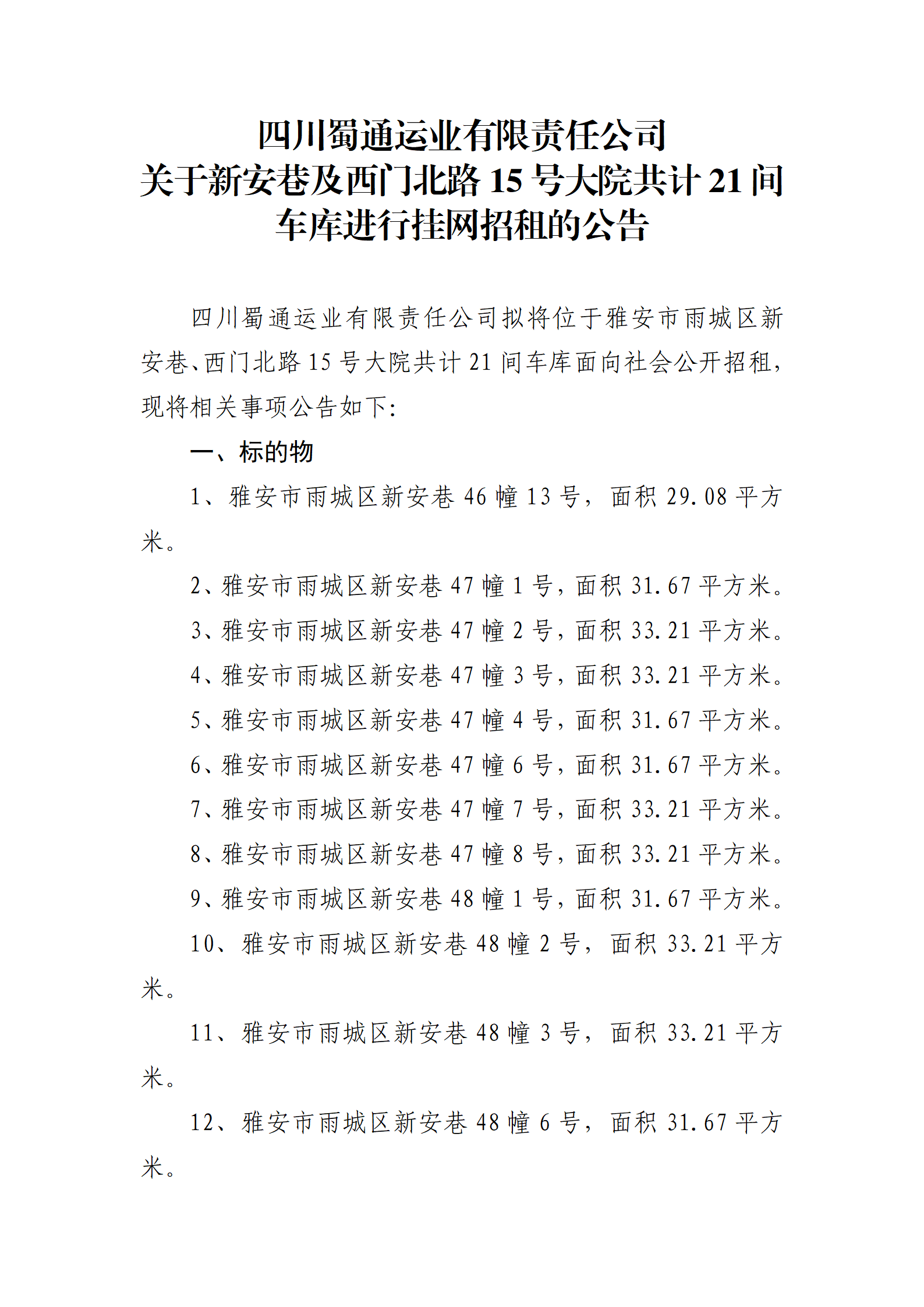 四川蜀通運業(yè)有限責任公司 關(guān)于新安巷及西門北路15號大院共計21間車庫進行掛網(wǎng)招租的公告