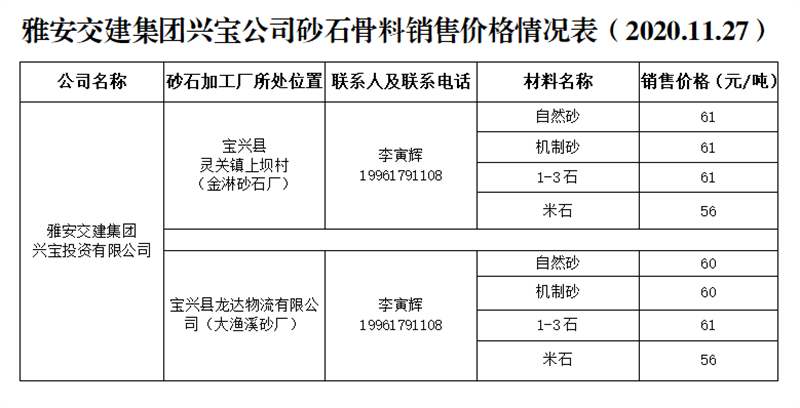 ÑŰ²½»½¨¼¯ˆF(tu¨¢n)ÅdŒš¹«Ë¾É°Ê¯¹ÇÁÏäNÊÛƒr(ji¨¤)¸ñÇé›r±í£¨2020.11.27£©
