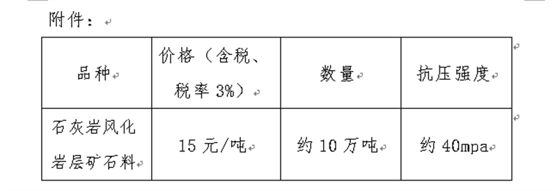 現(xiàn)將我公司礦山首采平臺(tái)的石灰?guī)r風(fēng)化巖層礦石料定價(jià)出售事宜進(jìn)行公示(見(jiàn)附件),經(jīng)公司研究決定,定價(jià)出售風(fēng)化巖層礦石料約10萬(wàn)噸,現(xiàn)通過(guò)集團(tuán)公司官網(wǎng)信息公示后對(duì)外銷售。報(bào)名客戶數(shù)不限,銷售方式為先款后貨,簽約銷售,銷售時(shí)間以礦山開(kāi)采和生產(chǎn)計(jì)劃為準(zhǔn)。