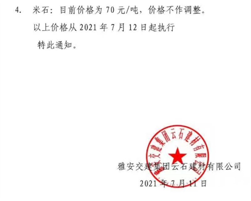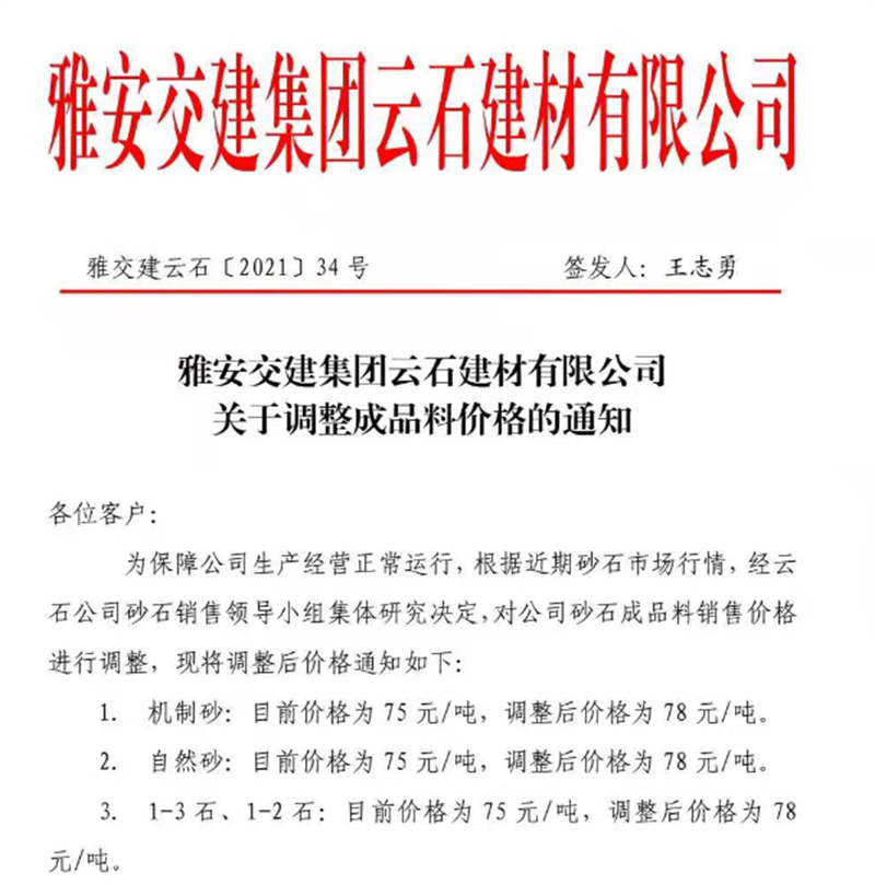 雅安交建集團(tuán)云石公司砂石骨料銷(xiāo)售價(jià)格情況表(2021.7.12)