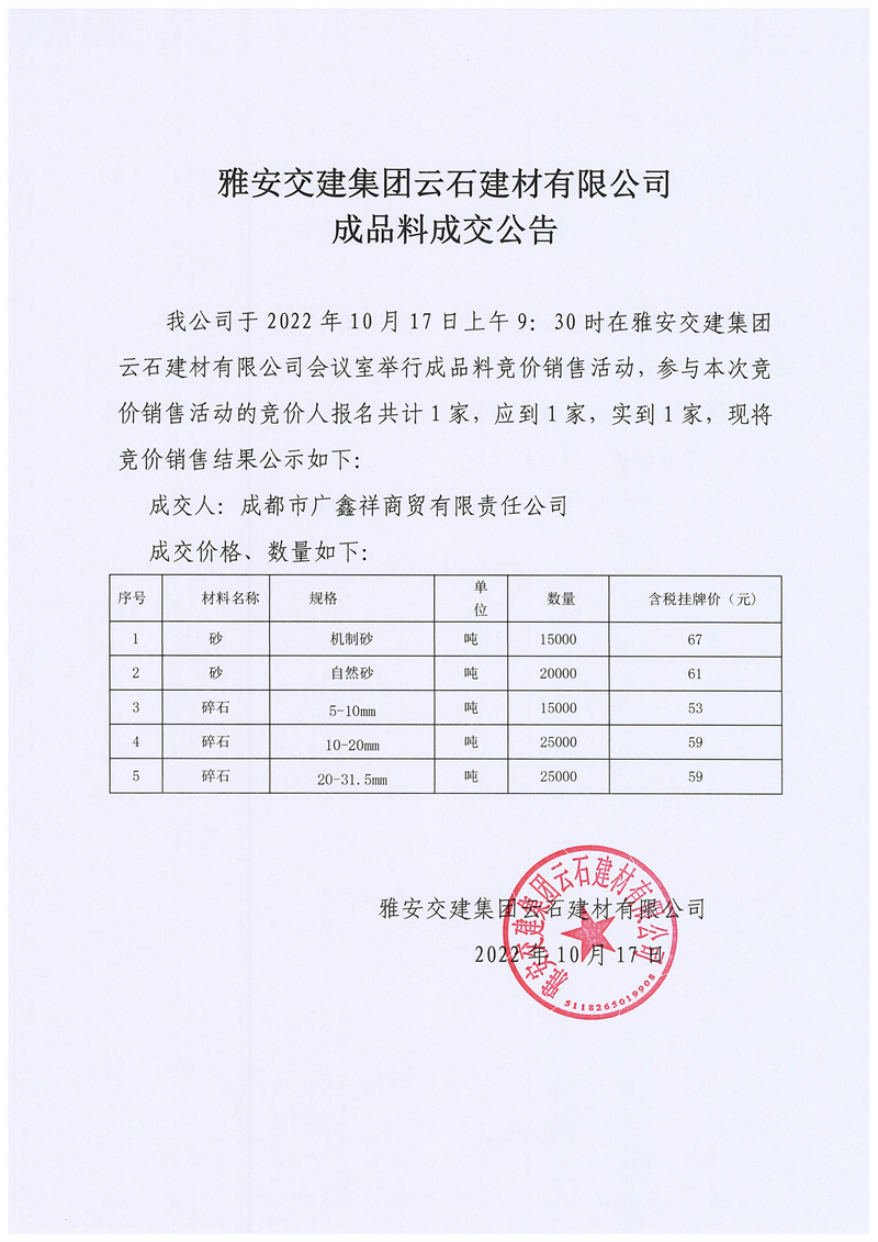 雅安交建集團云石建材有限公司成品料成交公告10.17