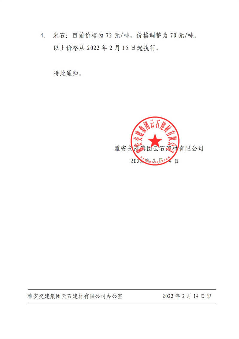 ÑŰ²½»½¨¼¯ˆF(tu¨¢n)ÅdŒšÍ¶ÙYÓÐÏÞ¹«Ë¾ êP(gu¨¡n)ÓÚÕ{(di¨¤o)Õûɰʯ³ÉÆ·ÁÏäNÊÛƒr¸ñµÄ֪ͨ£¨2022-2-23£©