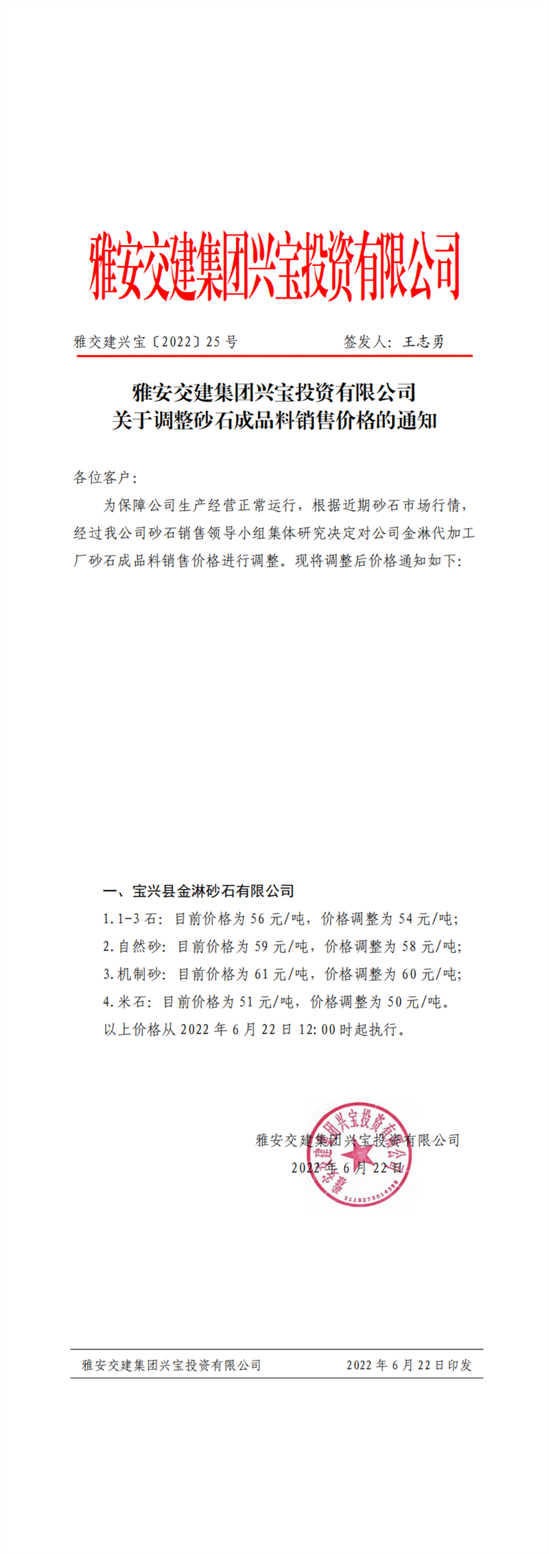 雅安交建集團興寶投資有限公司 關(guān)于調(diào)整砂石成品料銷售價格的通知(2022-6-22)
