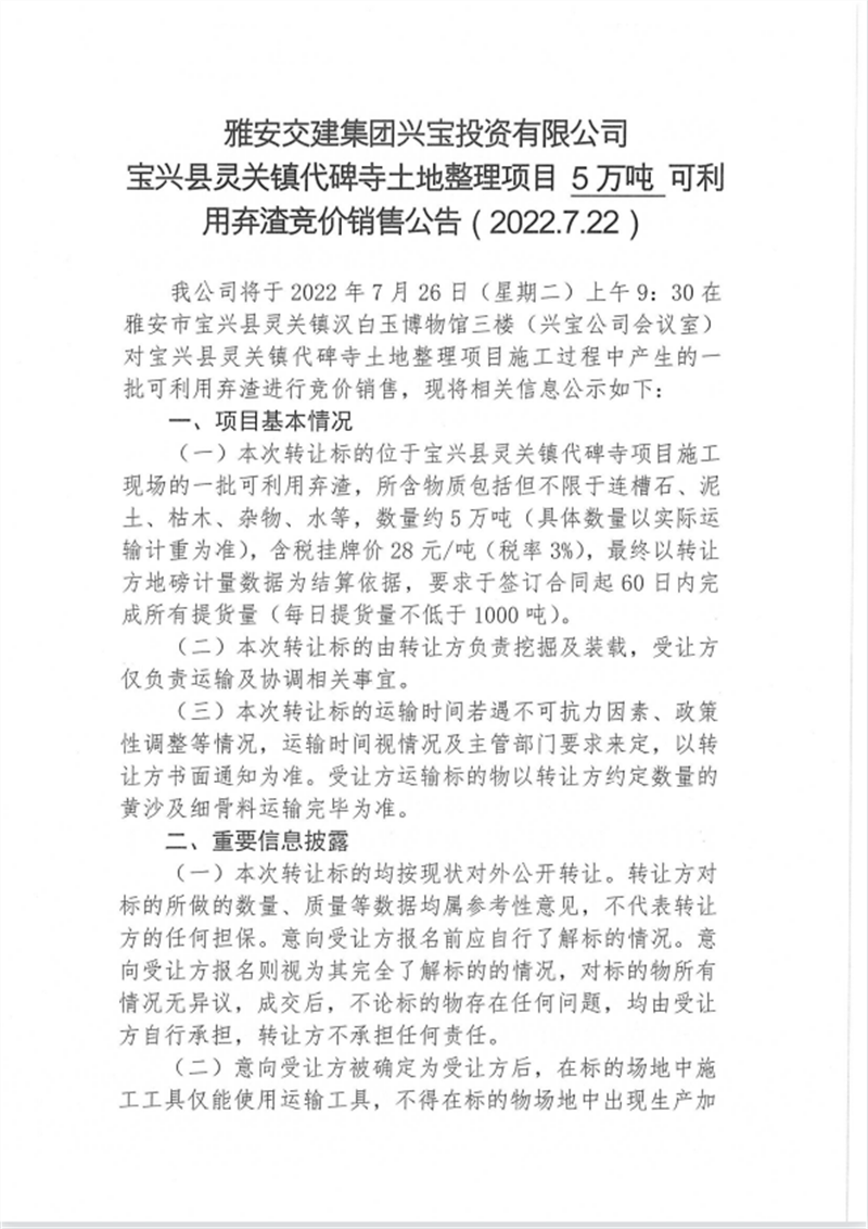興寶公司寶興縣靈關(guān)鎮(zhèn)代碑寺土地整理項(xiàng)目10萬噸可利用棄渣競(jìng)價(jià)銷售掛網(wǎng)公告7.22(10萬噸)
