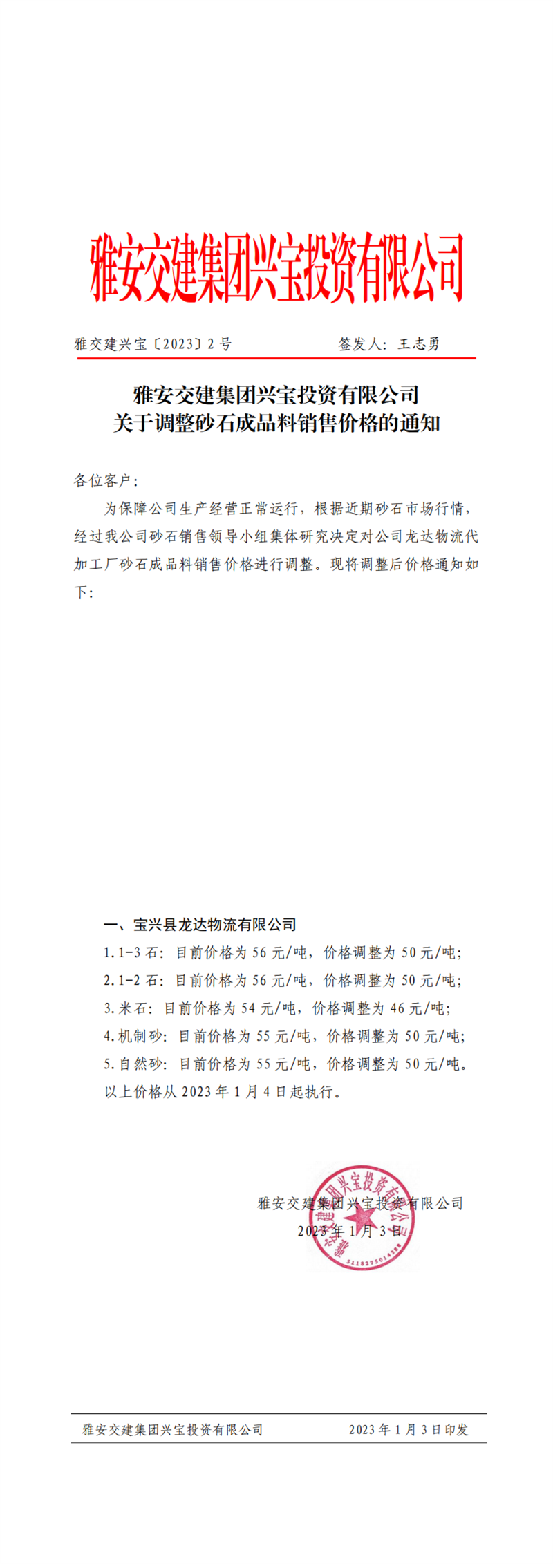 雅交建興寶〔2023〕2號 關(guān)于調(diào)整砂石成品料銷售價(jià)格的通知-2023-01-03