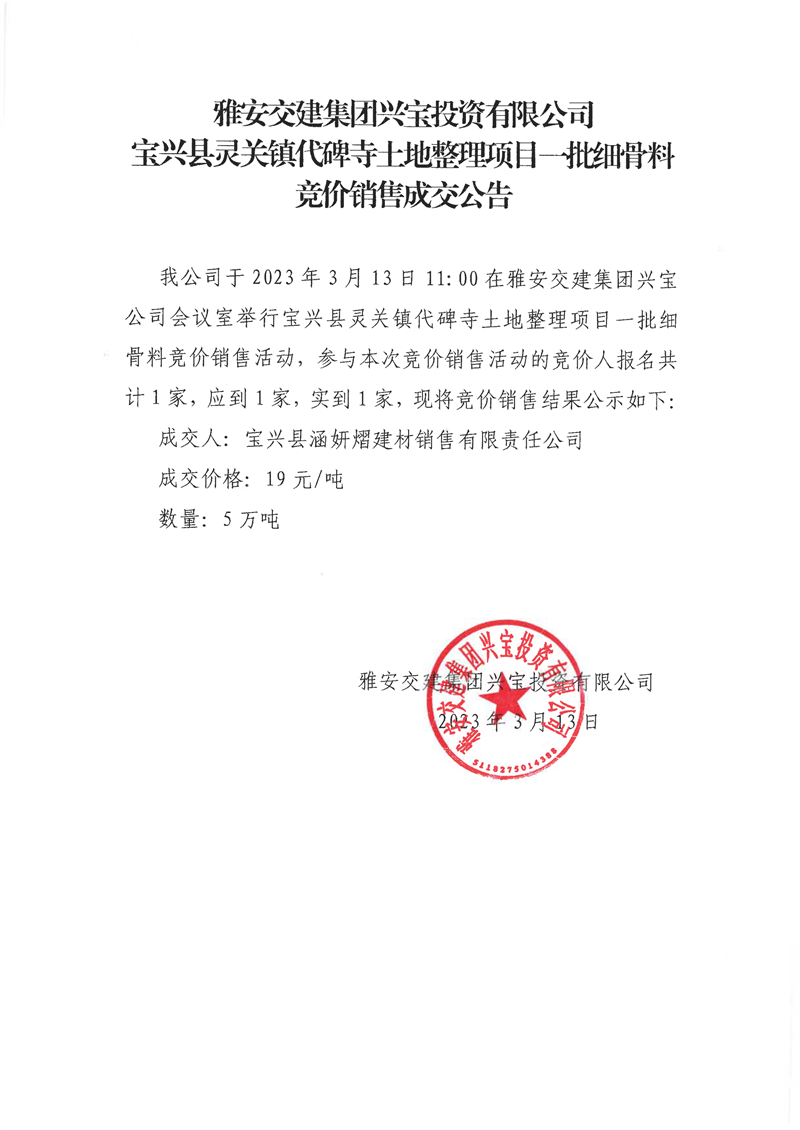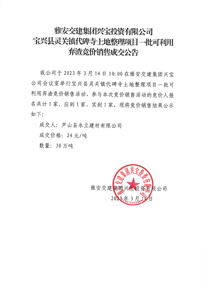 雅安交建集團(tuán)興寶投資有限公司30萬噸可利用棄渣競價(jià)銷售成交公告、5萬噸細(xì)骨料竟價(jià)成效公告(2023.3.14)