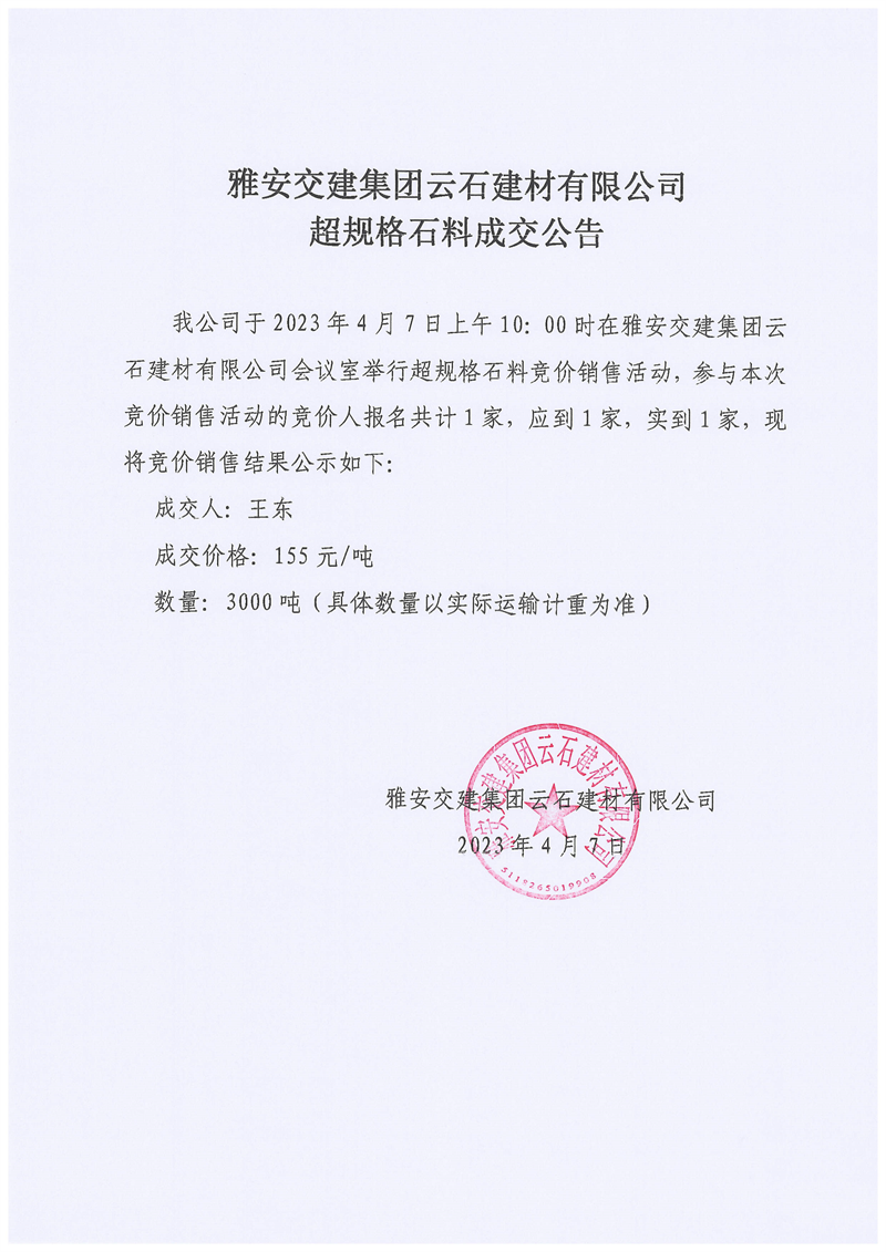 ÑŰ²½»½¨¼¯ˆF(tu¨¢n)ÔÆÊ¯½¨²ÄÓÐÏÞ¹«Ë¾³¬ÒŽ(gu¨©)¸ñʯÁÏÅÄÙu(m¨¤i)³É½»¹«¸æ£¨2023-4-7£©